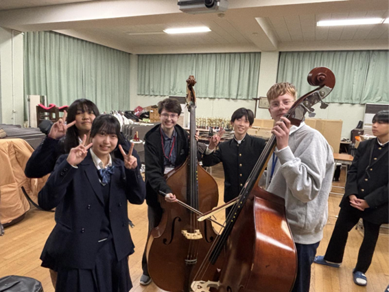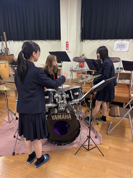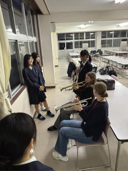 ・11/5(水)にドイツ人留学生が吹奏楽部に体験に来ました。「ファンキー!イッチョライ」を演奏後、様々な楽器の体験をしました。