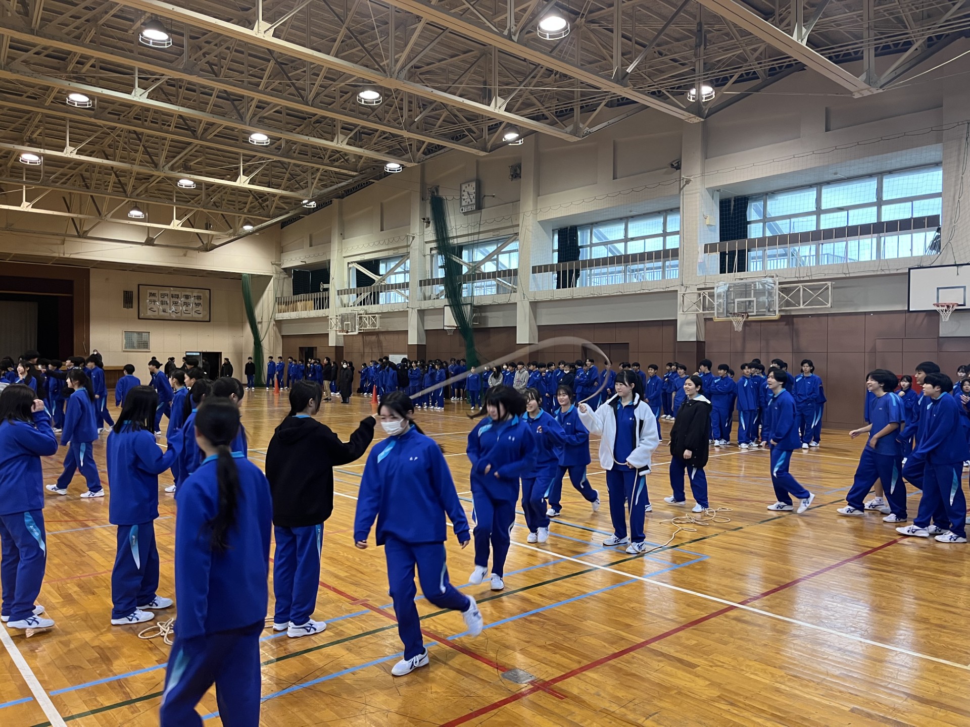 1月8日(木)、1学年のLHで「大縄大会」を開催しました。クラス対抗で、八の字跳びや一斉跳びなど、複数の種目に挑戦しました。