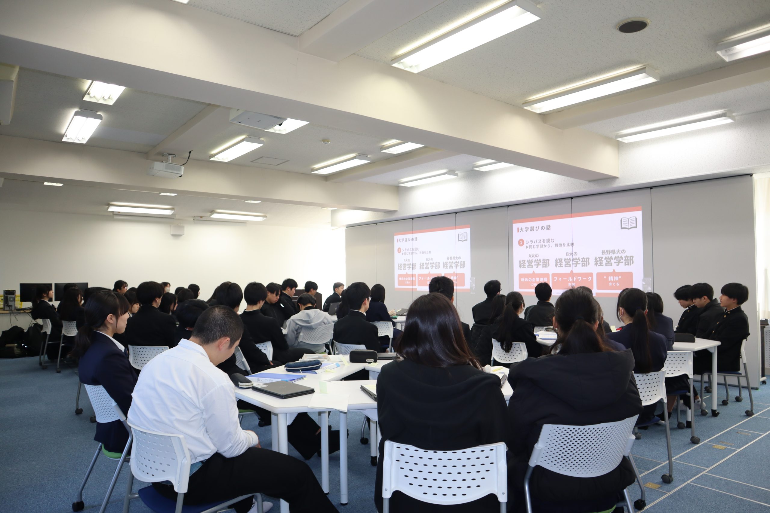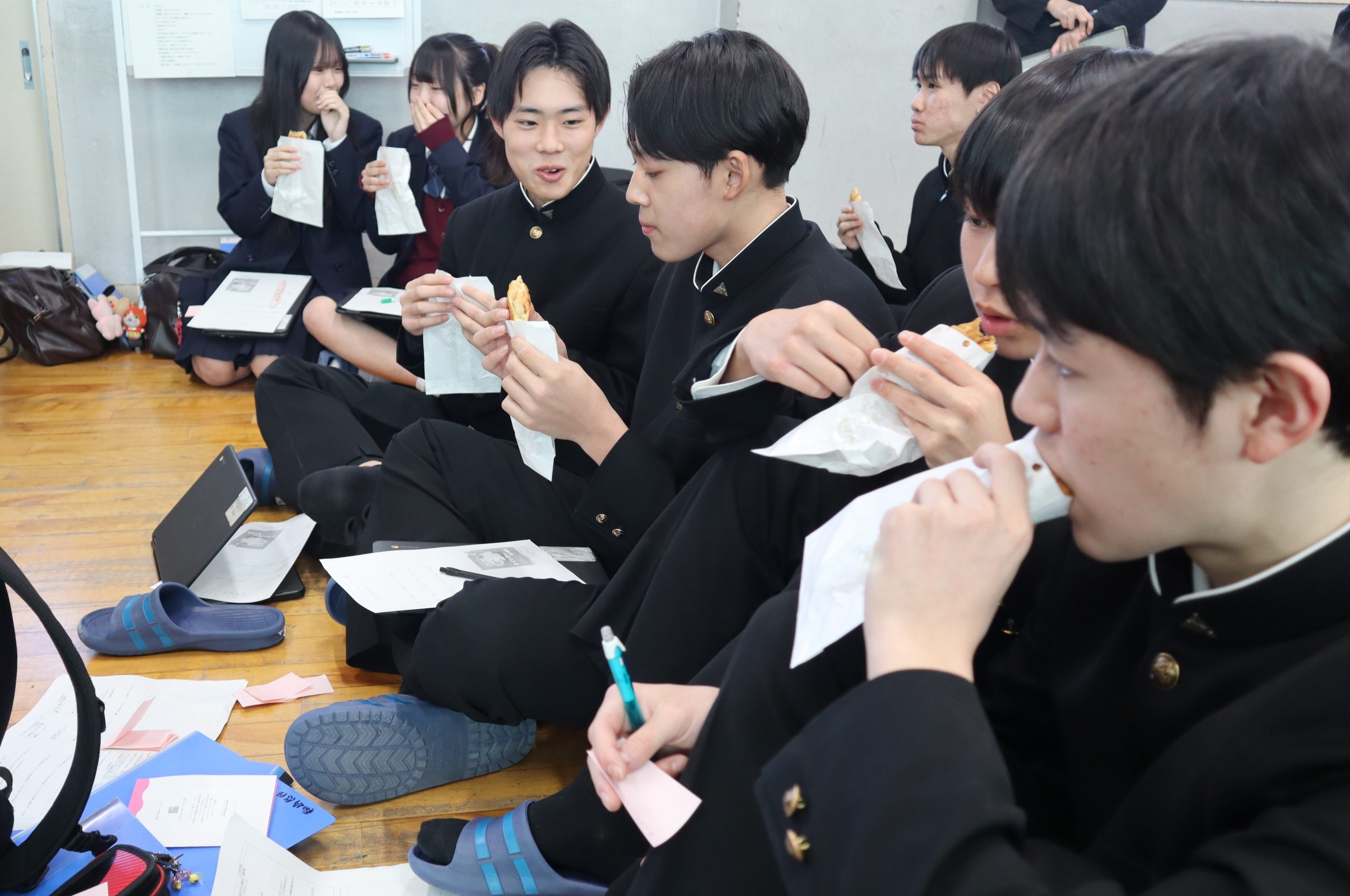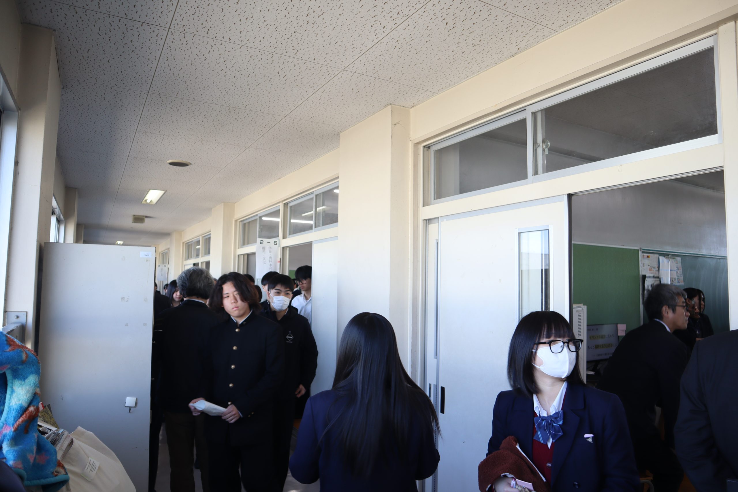 午前の部「探究発表セッション」では、1 年生はこれからの探究活動に向けた課題設定の経緯や問題意識について発表し、2 年生は 2 年間取り組んできた探究の成果をまとめて発表しました。食・農林水産、交通・まちづくり、ものづくり、健康・福祉、防災・環境、観光・文化など多様な領域の探究が並び、どの教室でも活発な質疑応答が行われました。発表を聞く生徒も付箋を使って積極的に質問し、互いの学びを深め合う姿が印象的でした。