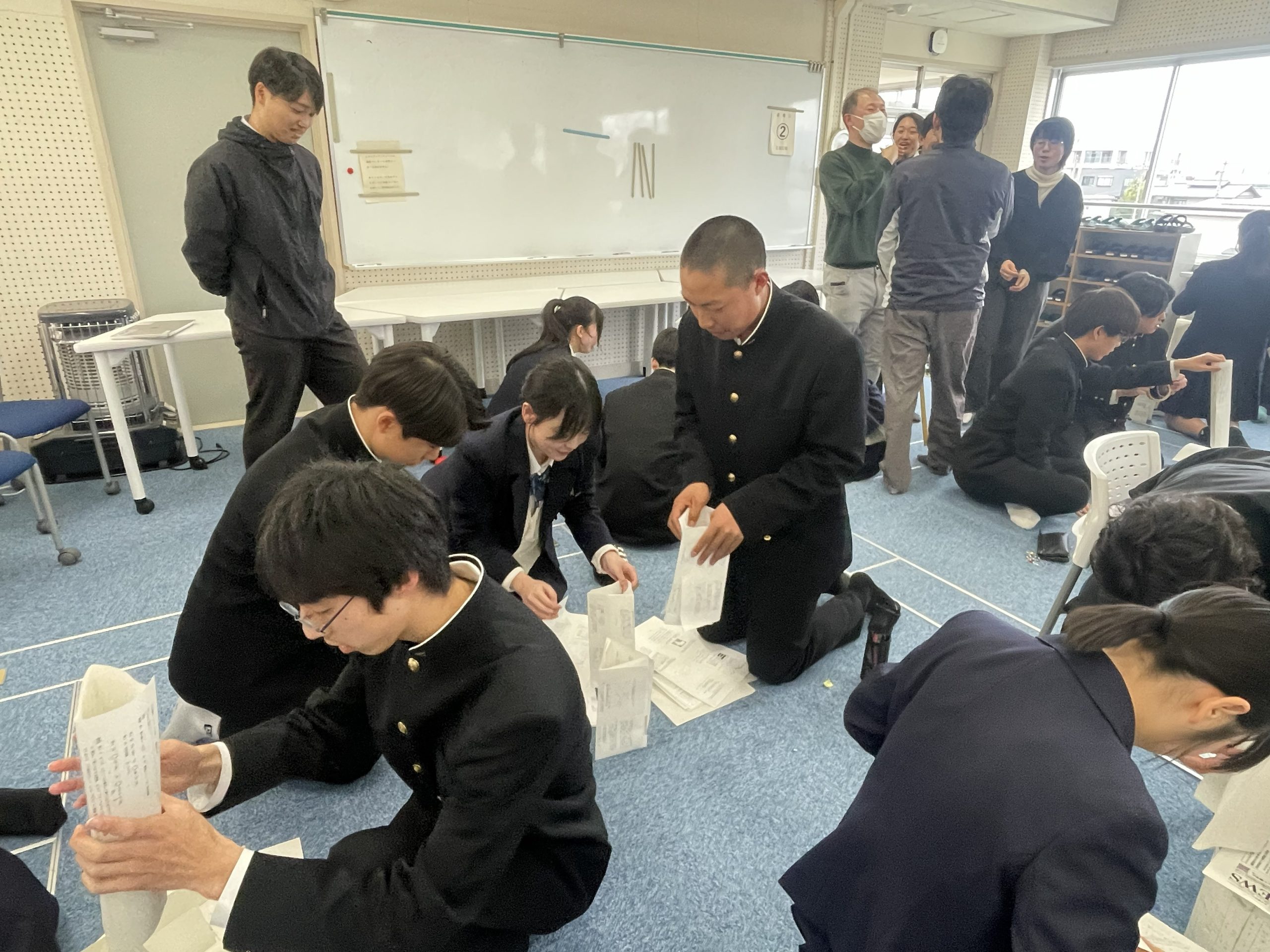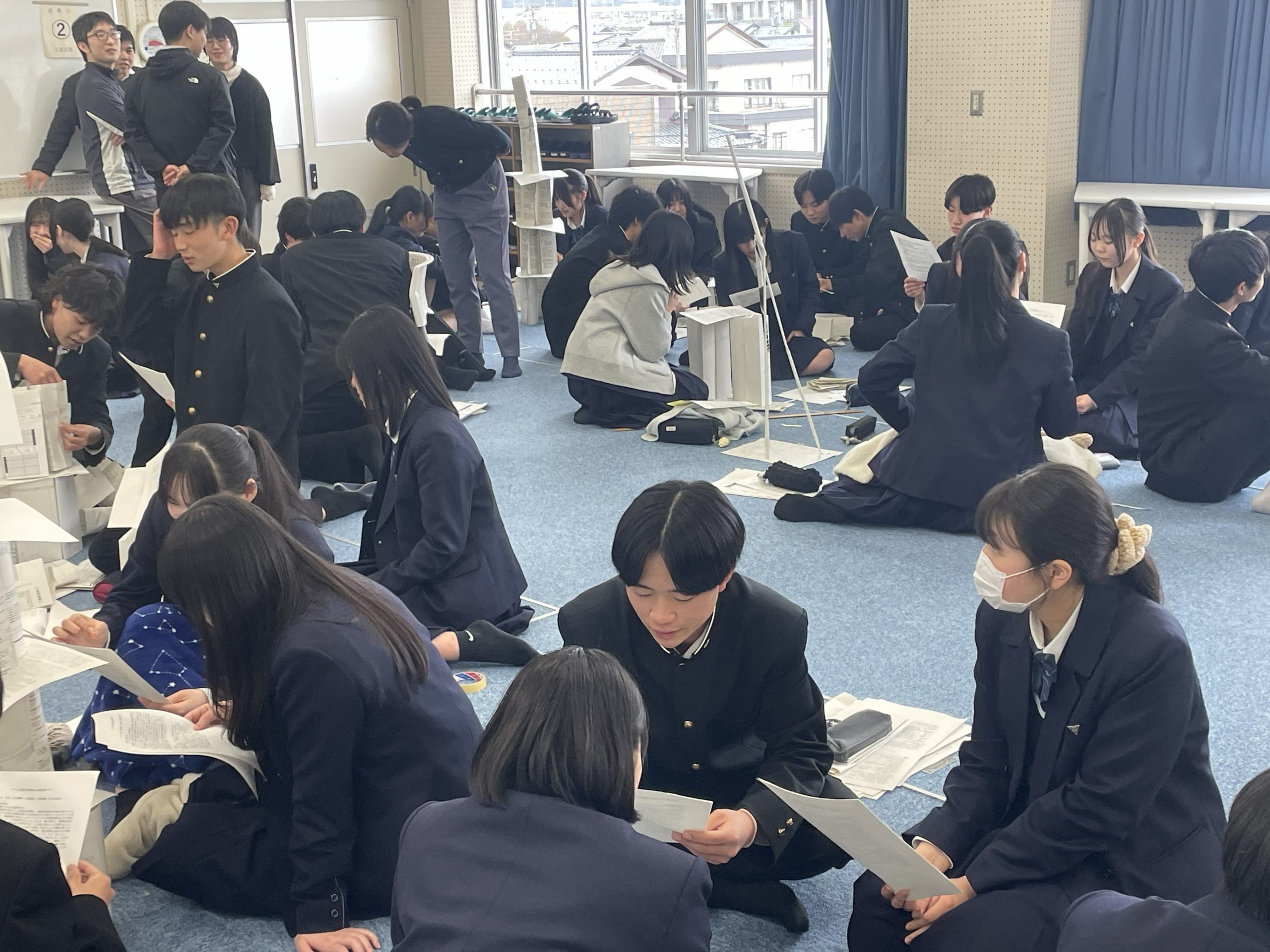6限目は「ペーパータワー」に挑戦し、紙とセロハンテープだけを使って、より高いタワーを作るために知恵を出し合いました。短い時間の中で役割分担を行い、試行錯誤しながら協力して取り組む姿が印象的でした。続いて、2年生から1年生へ、これまで取り組んできた探究活動について報告してもらいました。テーマ設定に悩んだ経験、調査を進めるうえで苦労した点、やりがいを感じた瞬間など、実体験に基づいた話はどれも説得力があり、1年生にとって次年度の探究活動を具体的にイメージする貴重な機会となりました。